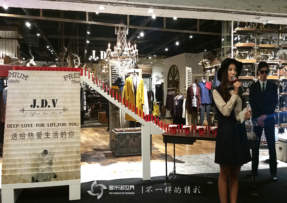 2015年9月12日,在時尚地標-太古里,J.D.V三里屯店盛大啟幕?!岸嗝字Z世界”團隊助陣,演繹酷炫時尚多米諾啟動儀式,亞洲街舞王子黃景行與眾嘉賓共注香檳啟動首枚骨牌,慶祝三里屯店開業(yè),隨后的超模服裝秀,異國風情熱舞,令時尚氣息現(xiàn)場爆棚!