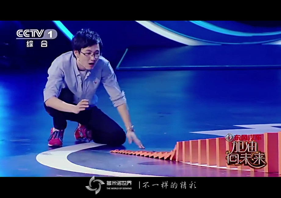 2016年8月7日,作為具有時代感、代表性的科學(xué)實驗項目:多米諾骨牌,出現(xiàn)在《加油!向未來》第6期的節(jié)目中。本著嚴(yán)謹(jǐn)?shù)目茖W(xué)態(tài)度,節(jié)目攝制組特別邀請多米諾世界團隊,完成大小多米諾競速的科學(xué)試驗。