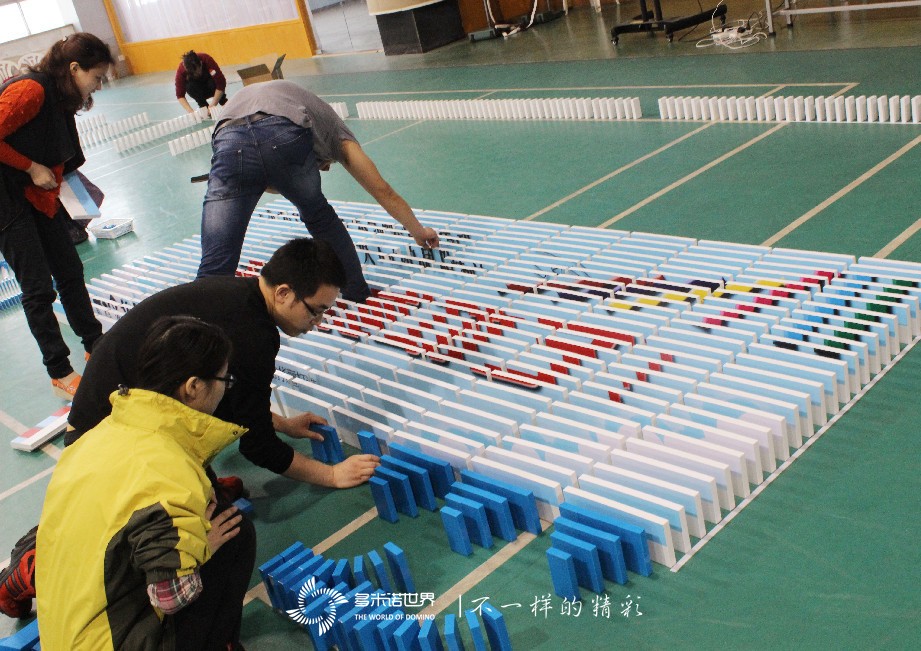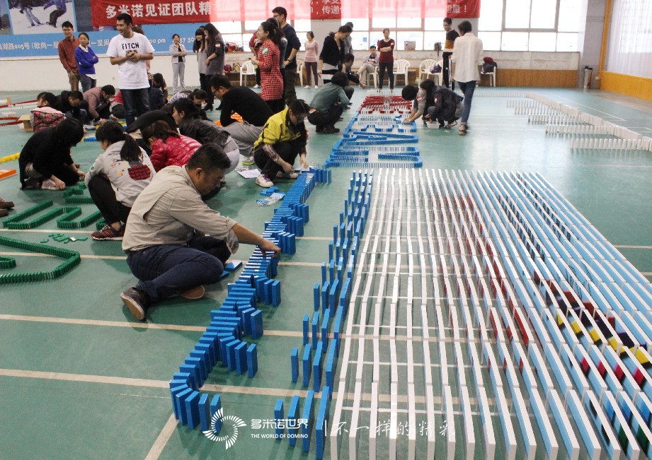 6個(gè)小時(shí),80名隊(duì)員,40000枚骨牌在蘇州電視媒體的見證下,由外名團(tuán)隊(duì)代表共同啟動(dòng),骨牌由一個(gè)“多彩中國(guó)結(jié)”開始,經(jīng)過(guò)“團(tuán)隊(duì)心連心”立下“勝利的希望”用“執(zhí)著、專注、協(xié)作、活力”共同將“夢(mèng)想啟程”高舉“勝利的旗幟”在“One Team One Dream”的口號(hào)聲中歡慶“我們成功了!”
