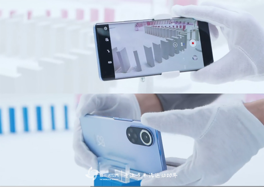 1077塊特制多米諾骨牌,10組聯(lián)動(dòng)機(jī)關(guān)裝置和場景的轉(zhuǎn)換,盡收在華為nova9手機(jī)的鏡頭中,實(shí)現(xiàn)了多個(gè)機(jī)位下“30秒不NG的挑戰(zhàn)”。