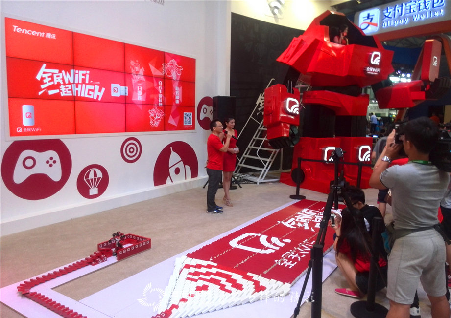 2014年7月31日,第十二屆中國(guó)國(guó)際數(shù)碼互動(dòng)娛樂(lè)展覽會(huì)(ChinaJoy)在上海新國(guó)際博覽中心舉行。騰訊首款全民級(jí)智能硬件“全民WiFi”首發(fā)現(xiàn)場(chǎng)采用了頗具創(chuàng)意的多米諾骨牌和WiFi機(jī)器人相結(jié)合的布局,主辦方特別從北京邀請(qǐng)吉尼斯紀(jì)錄團(tuán)隊(duì)-多米諾世界,策劃實(shí)施這個(gè)新穎的多米諾啟動(dòng)儀式。